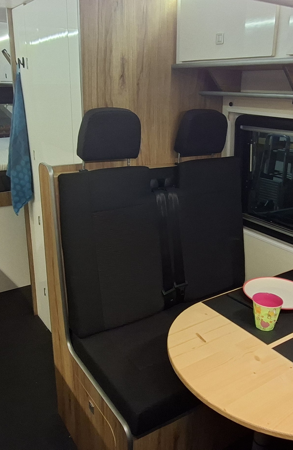 Hieronder vind je een technische omschrijving van een camperombouw waarin van een standaardopstelling met stoel en bank wordt overgegaan naar twee individuele zitplaatsen voorin en een gordelbok met goedgekeurde driepuntsgordels achterin.